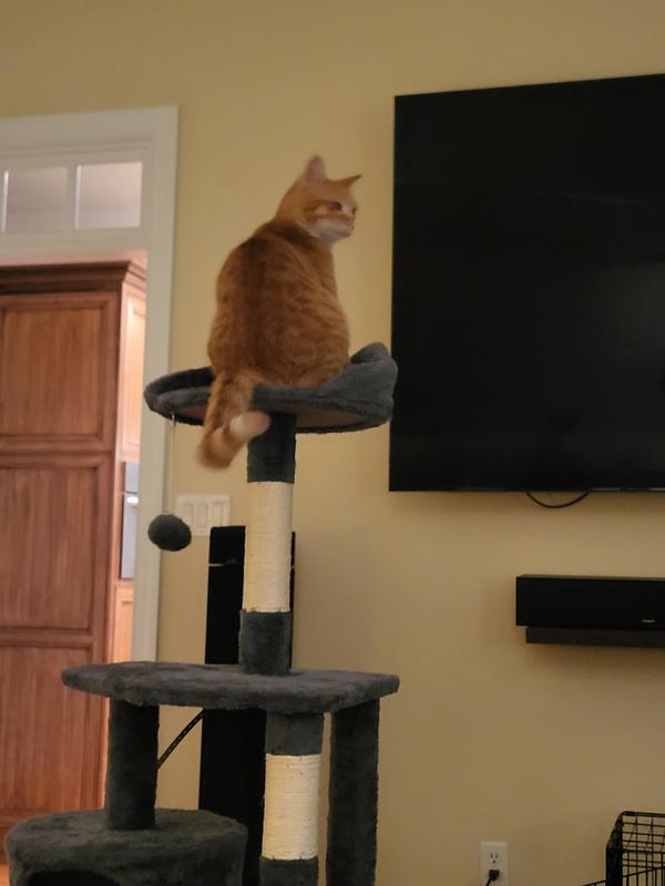 The particle wood platforms and support posts provide steady surfaces for your cat to climb up and down freely. An included safety strap lets you secure the cat tree to the wall, to help prevent damage and injury from tips during intensive jumping and play.