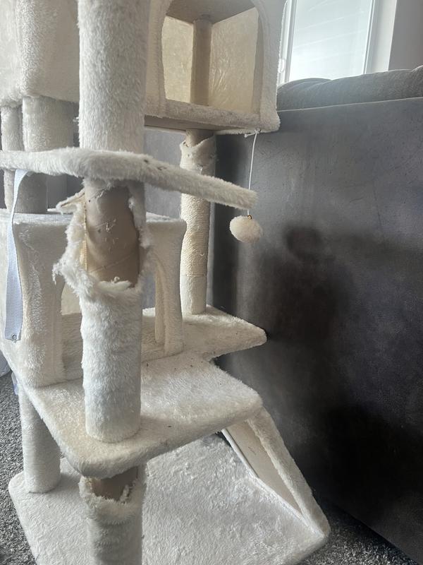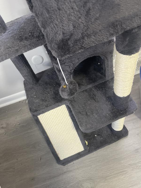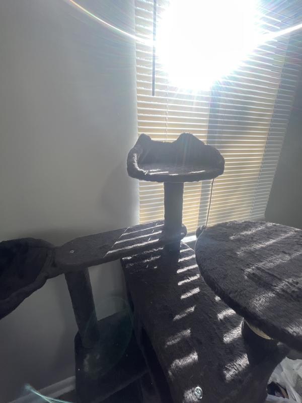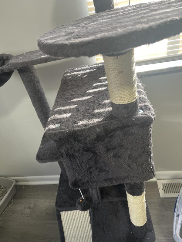 The particle wood platforms and support posts provide steady surfaces for your cat to climb up and down freely. An included safety strap lets you secure the cat tree to the wall, to help prevent damage and injury from tips during intensive jumping and play.