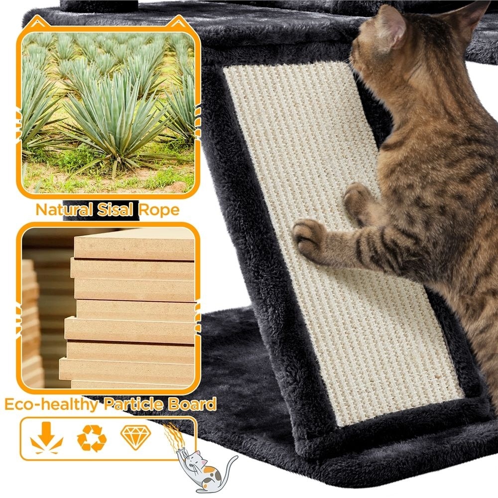 The particle wood platforms and support posts provide steady surfaces for your cat to climb up and down freely. An included safety strap lets you secure the cat tree to the wall, to help prevent damage and injury from tips during intensive jumping and play.
