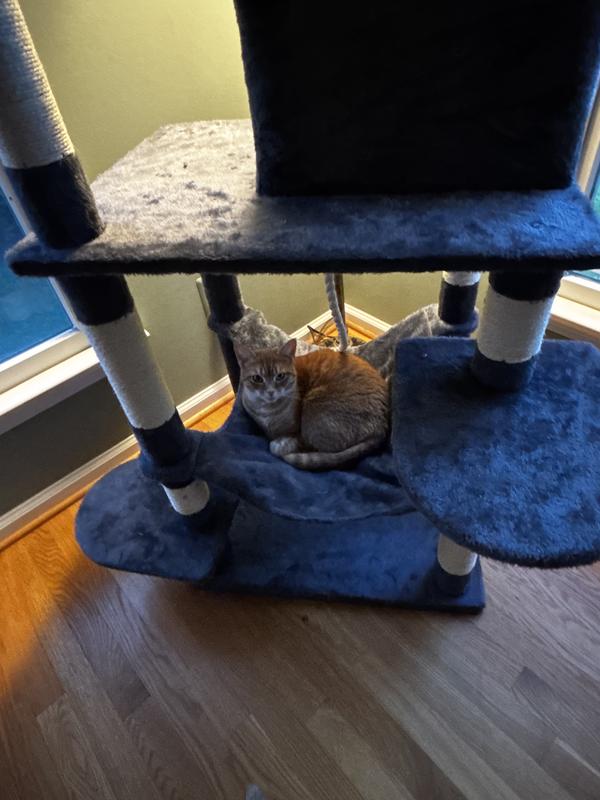The particle wood platforms and support posts provide steady surfaces for your cat to climb up and down freely. An included safety strap lets you secure the cat tree to the wall, to help prevent damage and injury from tips during intensive jumping and play.