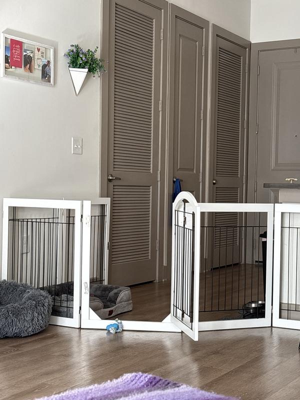 This gate has been incredible for our puppy. We’ve expanded her space as she grows. There are so many ways to easily configure this! It’s as long as the width of our living room. No other gate I researched was that long. Plus, no assembly required.