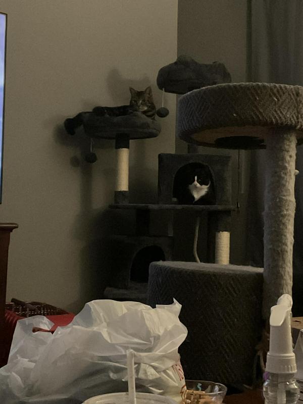 The particle wood platforms and support posts provide steady surfaces for your cat to climb up and down freely. An included safety strap lets you secure the cat tree to the wall, to help prevent damage and injury from tips during intensive jumping and play.