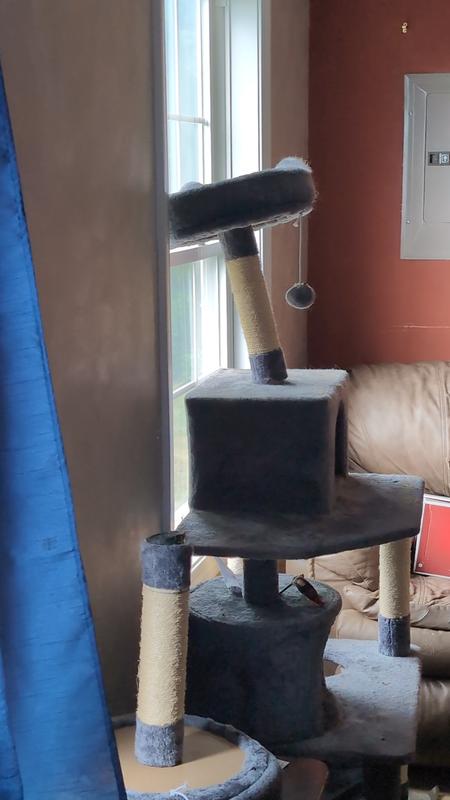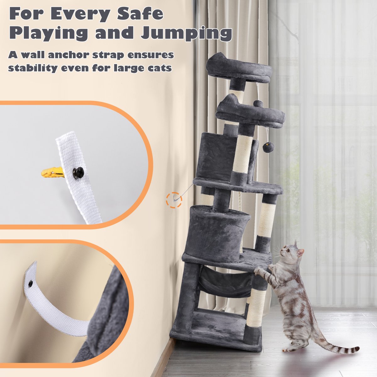 The particle wood platforms and support posts provide steady surfaces for your cat to climb up and down freely. An included safety strap lets you secure the cat tree to the wall, to help prevent damage and injury from tips during intensive jumping and play.