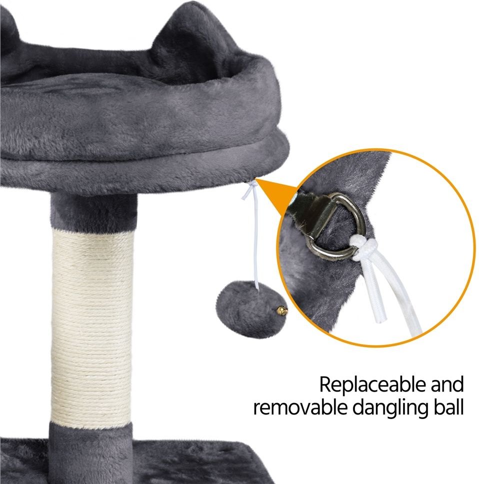 Two furball toys add extra excitement for your kitty, and you can also replace them with other hanging toys.