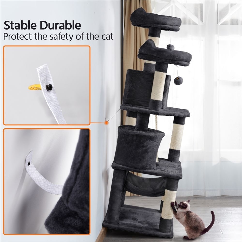 The particle wood platforms and support posts provide steady surfaces for your cat to climb up and down freely. An included safety strap lets you secure the cat tree to the wall, to help prevent damage and injury from tips during intensive jumping and play.