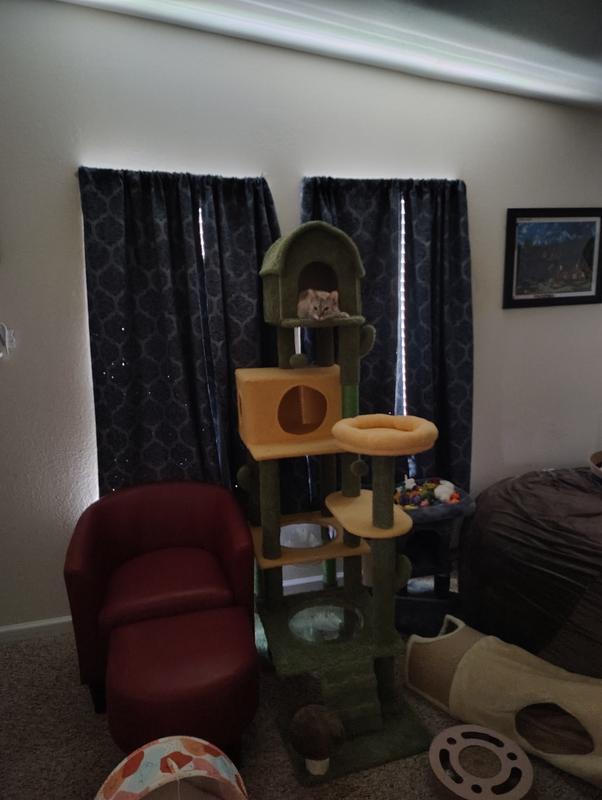 The particle wood platforms and support posts provide steady surfaces for your cat to climb up and down freely. An included safety strap lets you secure the cat tree to the wall, to help prevent damage and injury from tips during intensive jumping and play.