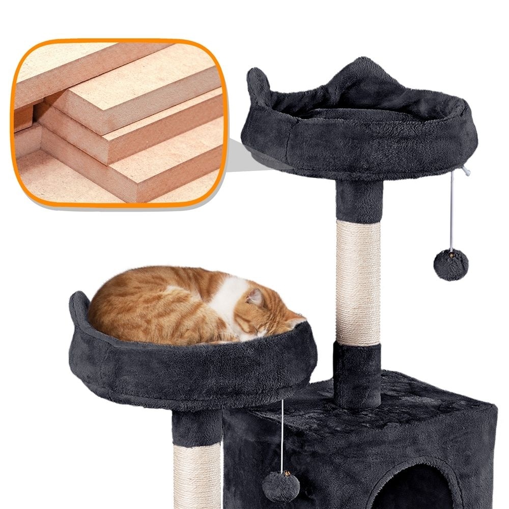 - This generous-sized cat tree features 2 cushioned perches, 2 roomy condos, and a soft hammock for your furry friend to lounge and survey her surroundings.