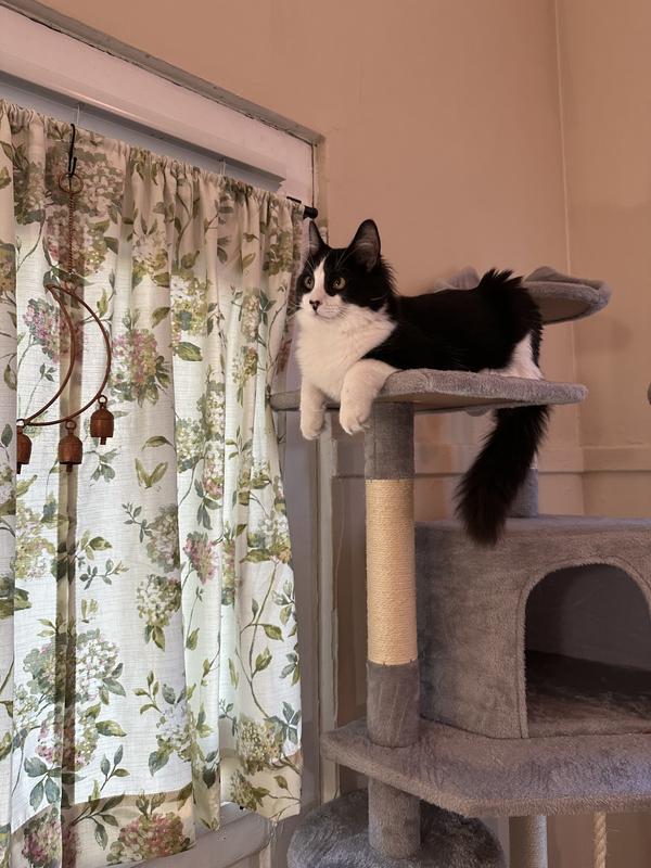 The particle wood platforms and support posts provide steady surfaces for your cat to climb up and down freely. An included safety strap lets you secure the cat tree to the wall, to help prevent damage and injury from tips during intensive jumping and play.
