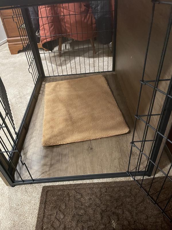 This crate features a solid floor, and also comes with a cushion.