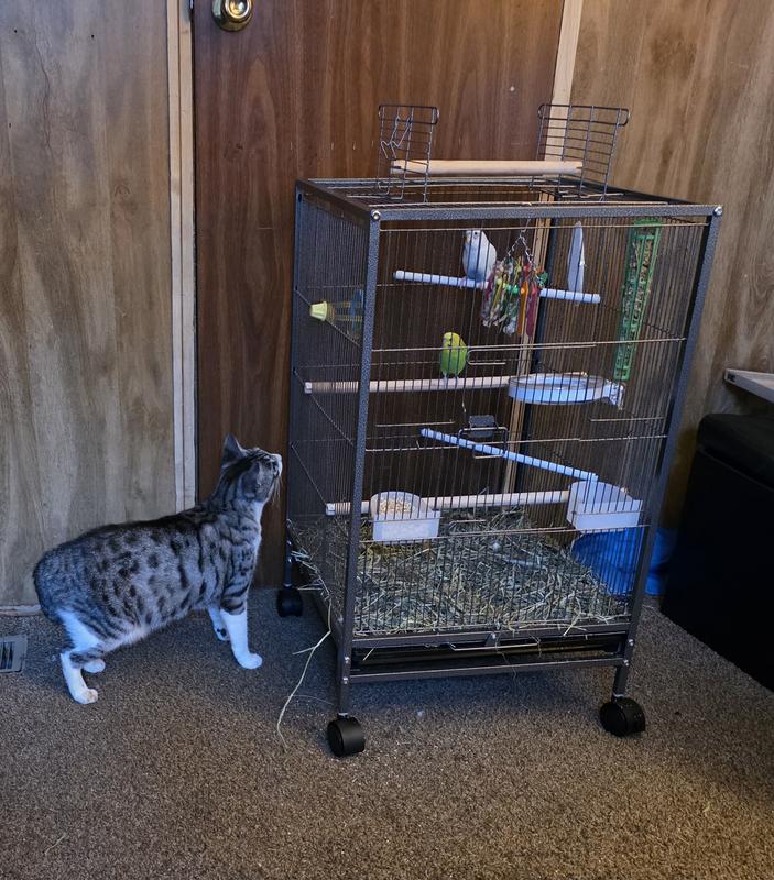 This cage is suitable for birds similar in size to Budgies, Canaries, Cockatiels, Finches, or Parakeets.