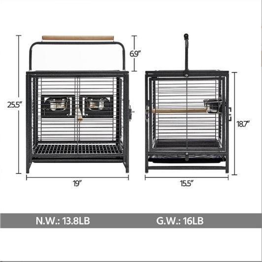 With a decent cage size of 19 inches long, 15.5 inched wide, 18.7 inches tall, and a bar spacing of 0.6'', this bird carrier cage will provide a spacious and safe short-term living space for small to medium-sized birds like canaries, budgies, parrotlets, lovebirds, conures, cockatiels.