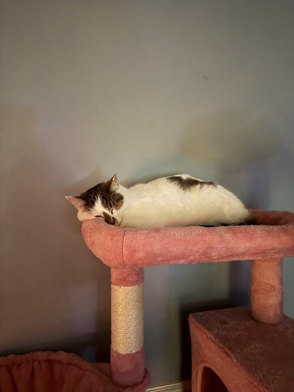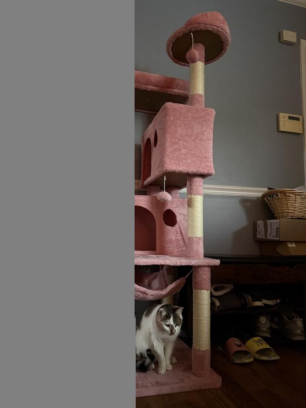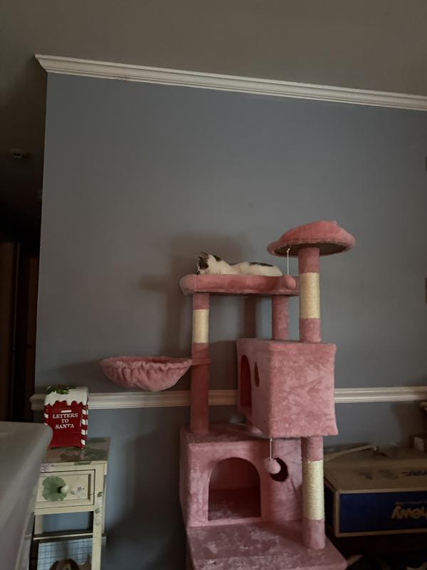 The particle wood platforms and support posts provide steady surfaces for your cat to climb up and down freely. An included safety strap lets you secure the cat tree to the wall, to help prevent damage and injury from tips during intensive jumping and play.