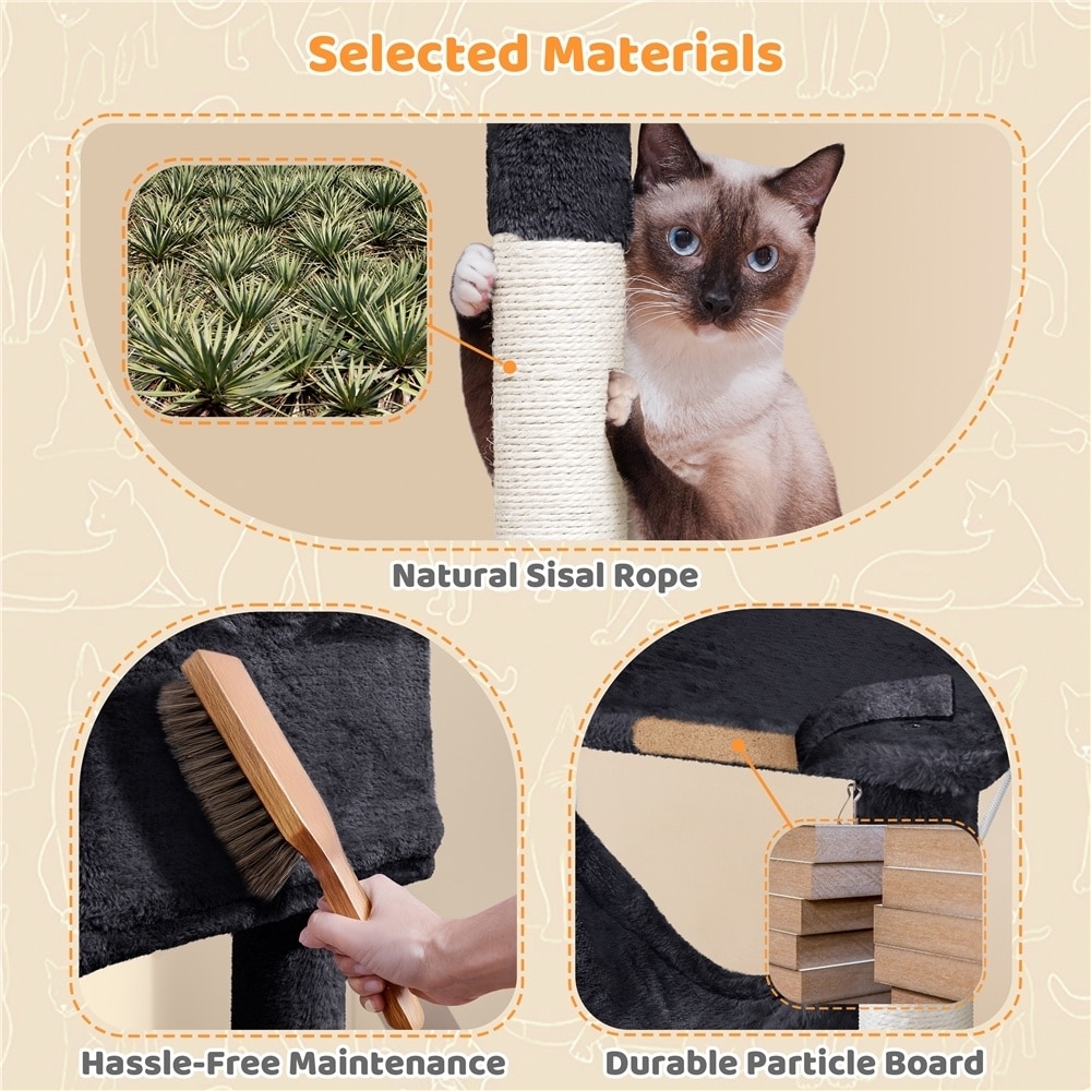 This cat tree is constructed of eco-friendly E1-compliant particle board, natural sisal, and skin-friendly soft plush fabric covering.