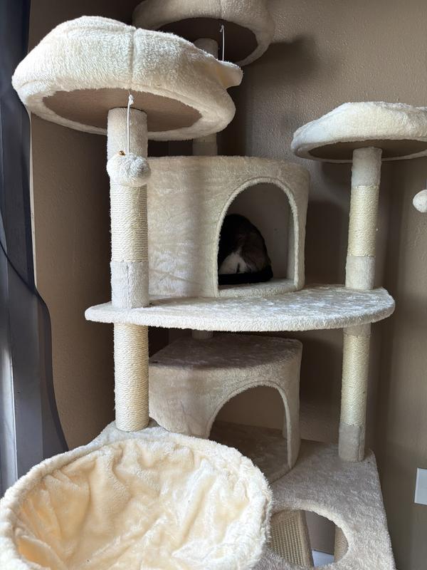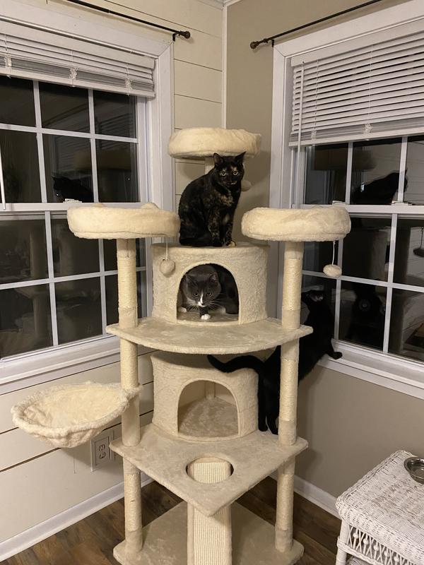 If you have older cats like I have they can't get on any of the upper levels due to there not being any over hang for each level for them to get on. My cats can get on the base, only the kitten can climb the scratcher to get to the next level which my cats can jump to but the next level and the top 3 perches are useless since they can't get up there. I bought this Brian's because I have the 63 or 68" one and it's fantastic without these issues. I should have paid more attention to it instead of just looking for the brand.