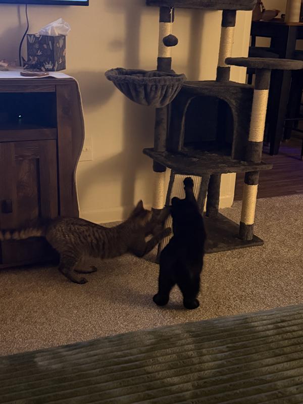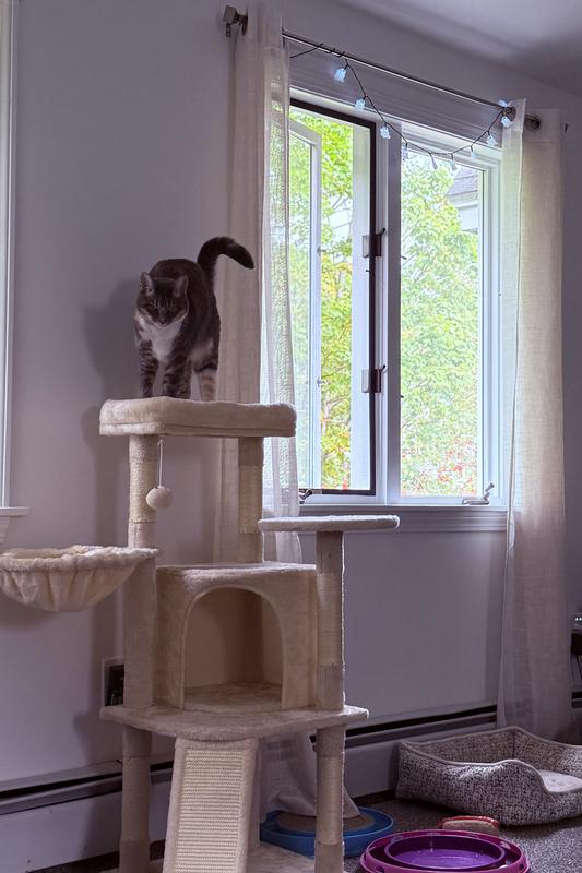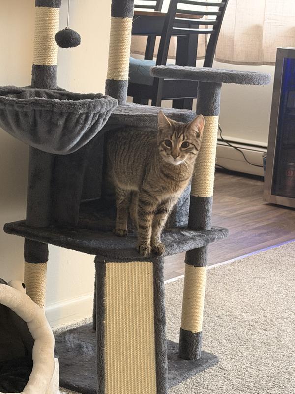 The particle wood platforms and support posts provide steady surfaces for your cat to climb up and down freely. An included safety strap lets you secure the cat tree to the wall, to help prevent damage and injury from tips during intensive jumping and play.