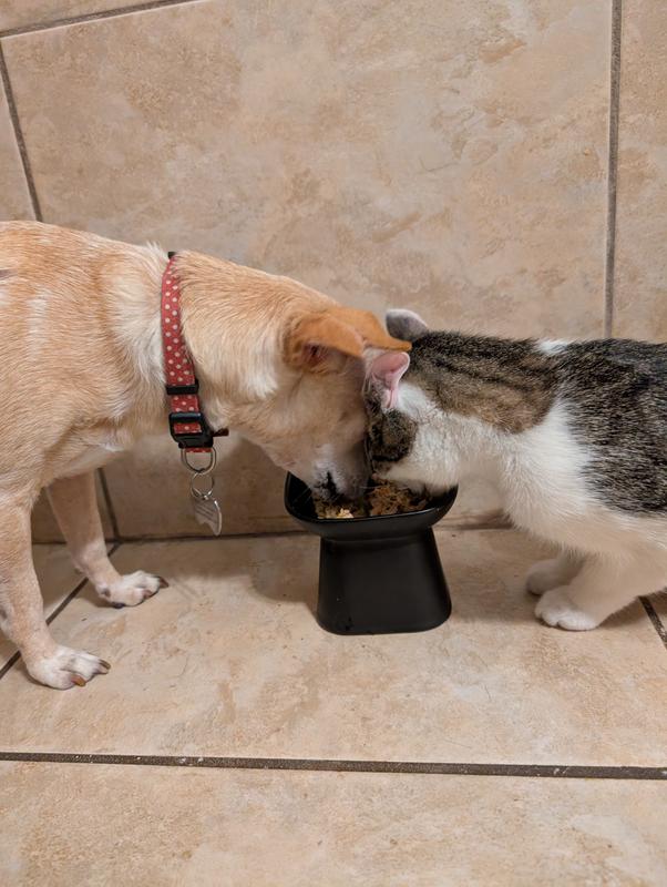 I was very pleased with both the style and the structure of this bowl. I'd originally got it for my cats, but I'm also using it for my new little 10 lb rescue dog. The packaging was amazing, really kept the bowl safe for my breakage, as it is ceramic. Both the cats and the dog like eating out of it.