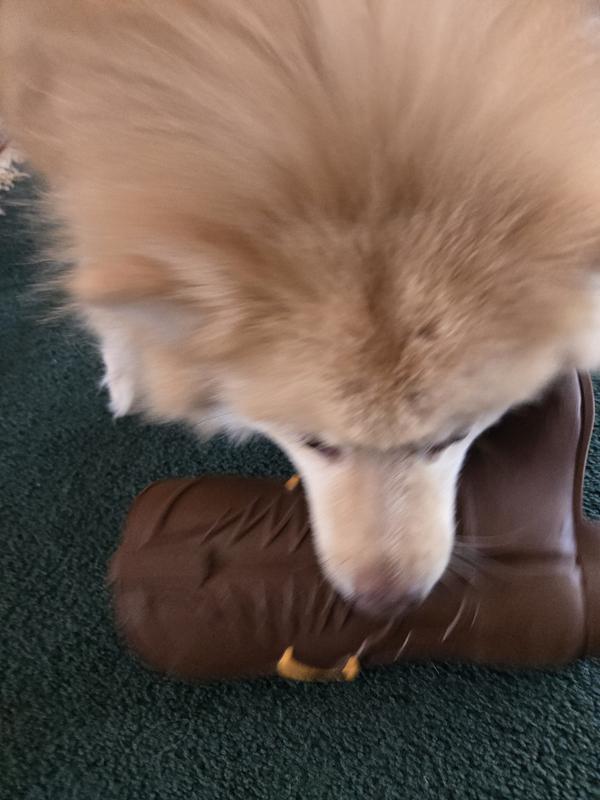 So gave this boot to my pack for Christmas and it's still intact. They are more about the stuffies but have been tossing this around, even tried to take it outside. Raven seems to enjoy the sound it makes. The squeak is pretty loud so I think that's the appeal.