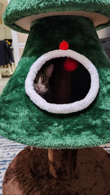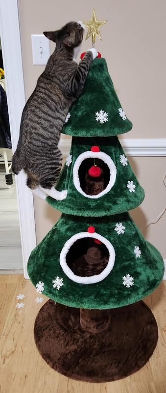 all our cats love this Christmas tree also its been thrilling to see them playing on and around it so far only Tatertot has climbed inside this Christmas tree but the others had been playing with the toy under the tree and climbed to the top to play with it theyve all had so much fun with this Christmas tree and the best part no pine needles to clean up and no need to water the tree like a real tree or having to struggle putting it away like a fake tree this tree is a much better option especially if you have lots of cats to enjoy it so glad we all agreed to this tree instead of a real tree .