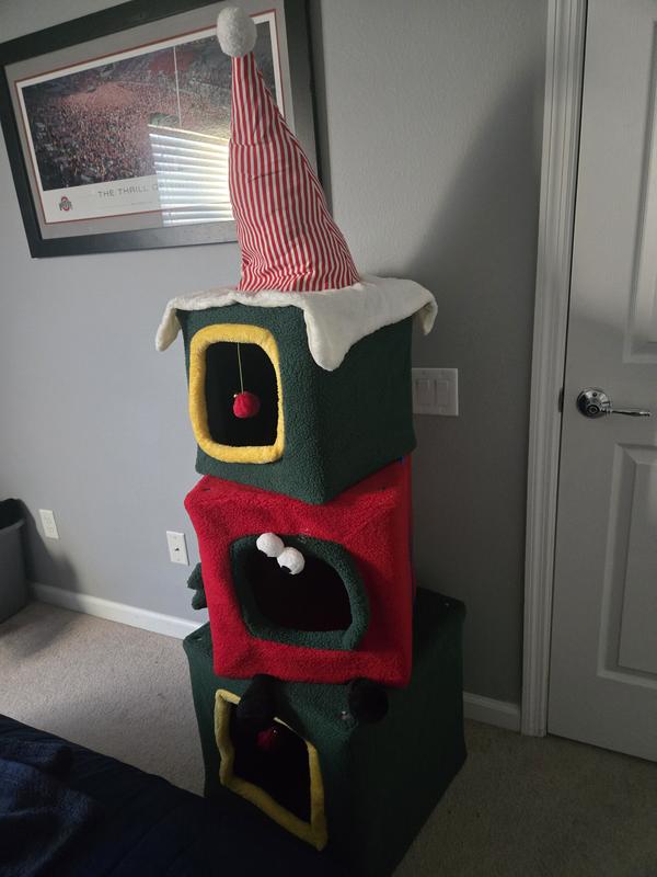 Bought this for my cats, it’s very roomie they love the bottom part of it. There is usually at least 1 cat in it. One thing I didn’t like was that the pieces fall off, so my cats usually avoid the top one, when they climb up it falls off. The screws to hold them together doesn’t hold the presents at all, there is no way to “tighten” it, the amount of time that the top gift has fallen and almost hit my cats is ridiculous.