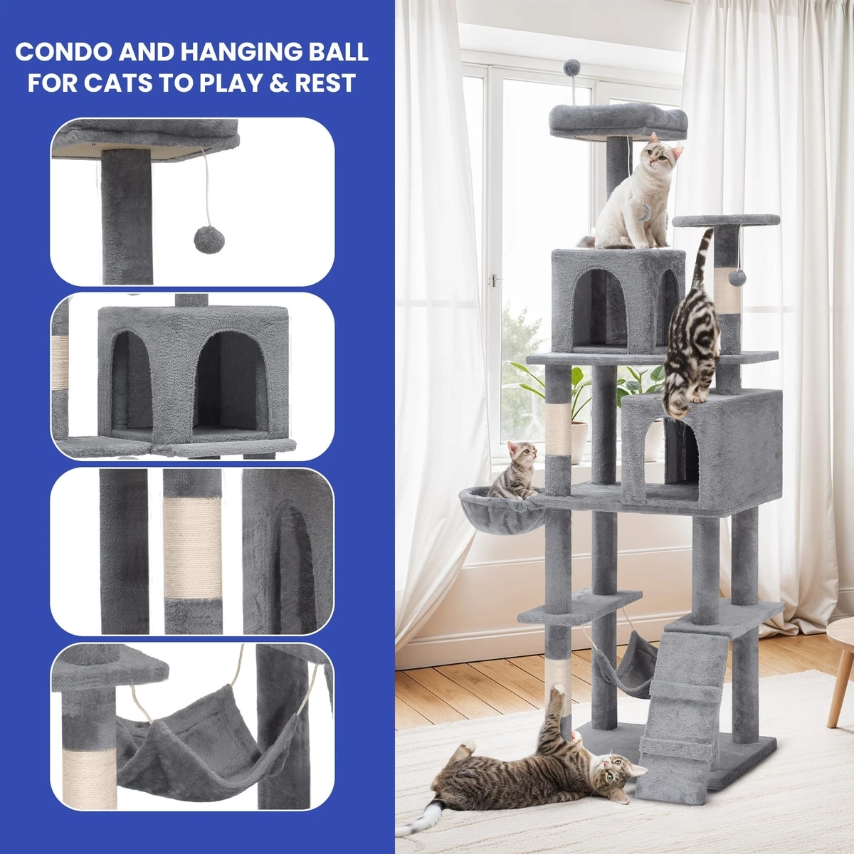 The design of this tree is dangerous for cats. There are clasps that attach the hammock that my cat got her toe stuck in. This resulted in an $800 trip to the emergency