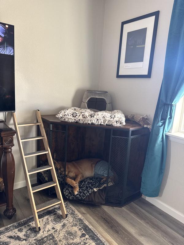 I have had this kennel for about a year now, and I absolutely adore everything about it! (Don’t mind my dogs underwear he just got neutered) but our dog absolutely needs a kennel to feel safe and comfortable. We had the typical giant metal one and it was so loud, it shifted all the time ruining the wall, and our cats had a bed on top they laid on all the time and it overall wasn’t a good fit. We ended finding this and trying it out. Not only does it take up like no space but our dog loves it as it is in the corner so he can see the front door and the entire house with it setup like this! We drilled a cat ladder into the side, put their beds on top and it works so well! We removed the door, but it is super easy to attach and reattach whenever you’d like. But because we don’t use it to lock him in we removed it. It is super sturdy, the perfect size and we get so many complements on it anytime someone comes over! One of my favorite pieces of furniture for my pets!!