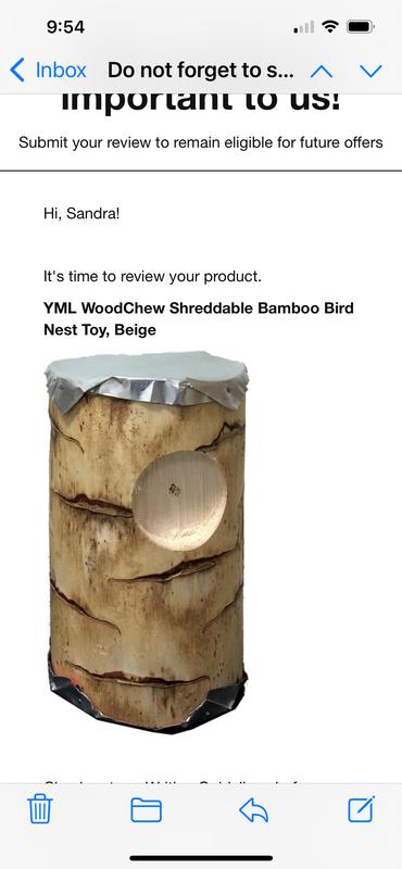 - Simply place the YML WoodChew Shreddable Bamboo Nest Toy in your buddy’s cage and watch him peck away—no assembly required.