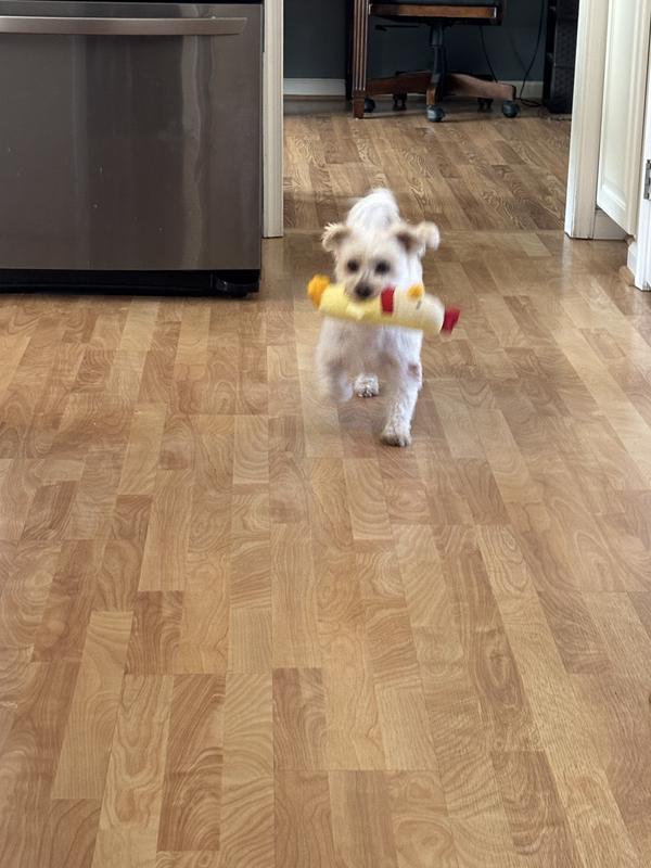 Adorable and oh so cute toy but my goldendoodle chewed through it in about 1 hour. Wish it would have lasted longer because not only is it cute but since it came