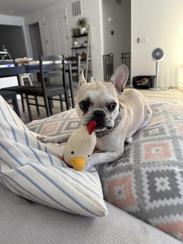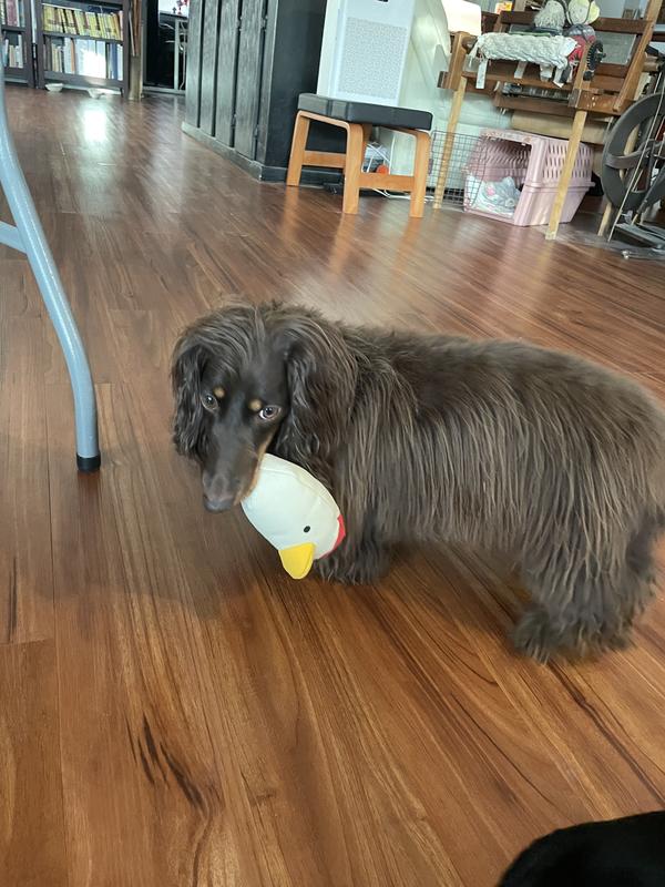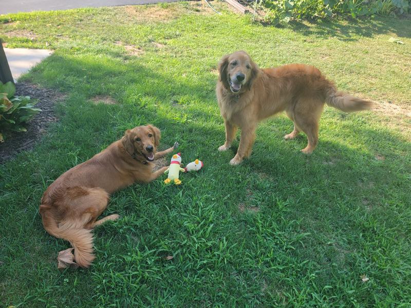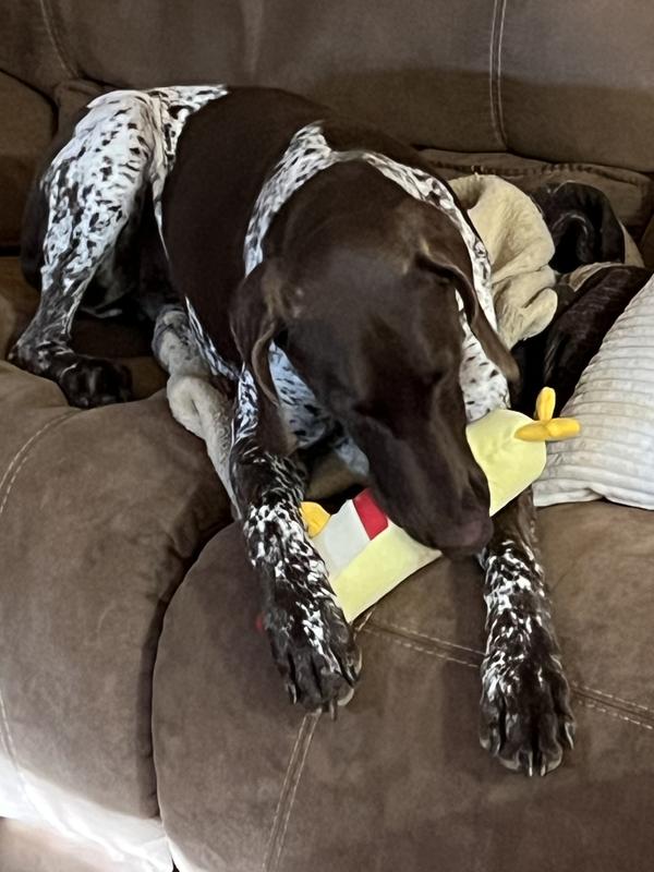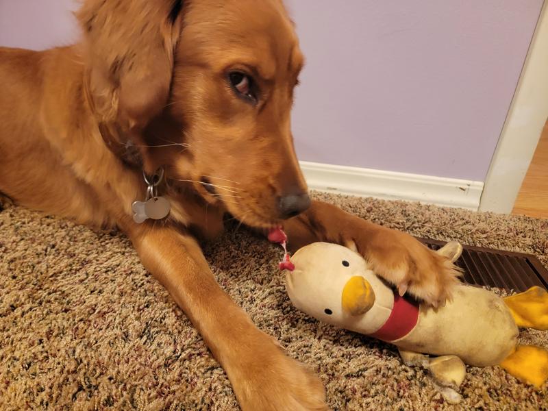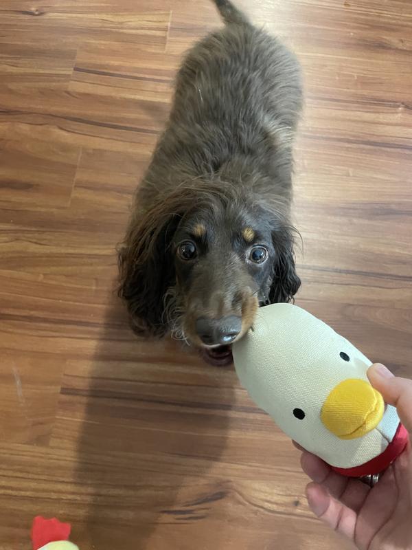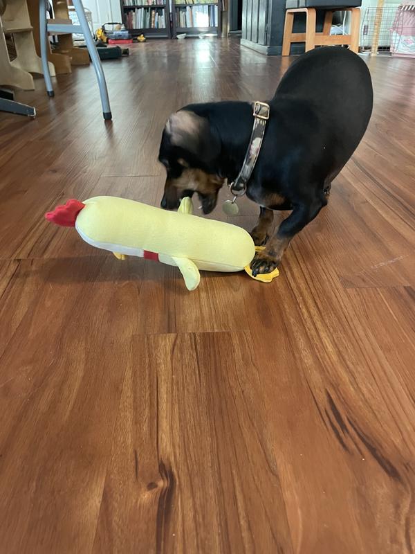 All my dogs went right for this Clucky plush toy. Individually our GSP really gets the most playful chews and playful interaction on this toy. It does not have