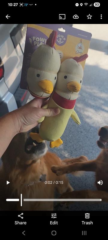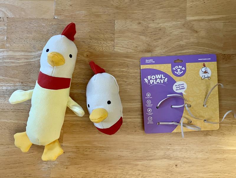 What the cluck! The little logo on the cardboard tag made me laugh out loud. I was so pleased that this toy was actually 2 toys! But we all know with 2 dogs, it doesn't matter, the only good toy is the one the other dog has! I would call this middle of the road durable. Mr Cluckers is already missing his comb and wing after a short time. My pup loves the crinkle noise inside and just goes to town on it. Light colored fabric shows dirt quickly if played with outside. Unboxing is always so exciting, somehow my pups know when the gift is for them.