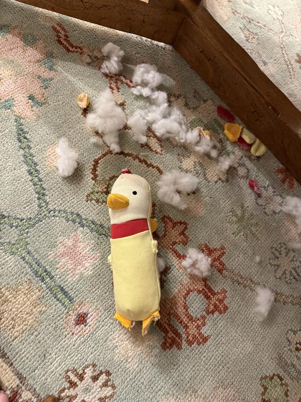 This is a very strong well made dog toy! My dogs loved the chicken body and the crinkly sounds the chicken and chick made! Very tough and durable - this will hopefully