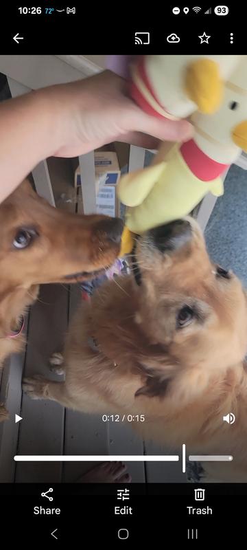 Adorable and oh so cute toy but my goldendoodle chewed through it in about 1 hour. Wish it would have lasted longer because not only is it cute but since it came with two toys I gave the smaller one to my cockapoo.