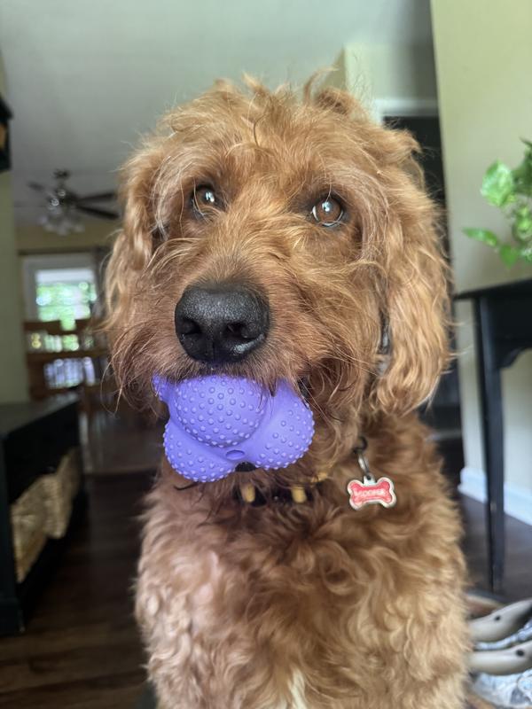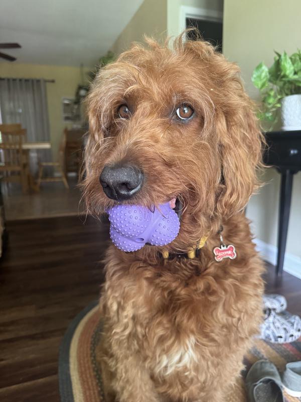 My doodle is a destroyer! most toys, bones, stuffies don’t make it past a few days, some only a few hours. We have had this ball for a week and it still looks new, not even chew marks. I worry about him choking on smaller balls so the shape and size of this ball is perfect! He can carry it in his mouth but no chance of him choking on it. The nubs help to clean his teeth as he chews on it. Not a good ball to throw or bounce in the house, it’s solid rubber.