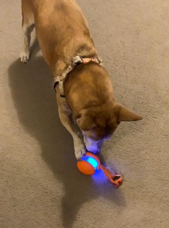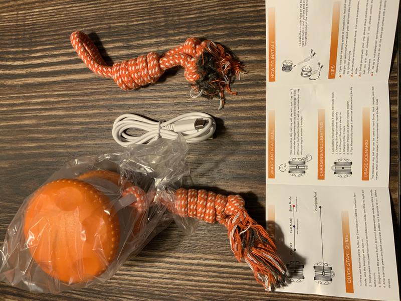The YVE LIFE Automatic Stimulation Random Path Electric Moving & Motion Boredom Relief Interactive Rolling Ball Dog Toy is amaaazing! It got my 14 year old senior dog off the couch and playing! It comes in a small box with a small rope attached, an additional rope in the box along with the USB charging cable to charge it and an instruction booklet. It came pre charged. Just push the red button on the side for 3 seconds and let it go! It has an irregular rolling sequence (it rolls in different directions and spins and vibrates) that keeps your dog on its toes. It lights up as well so you can play in the dark. 2 modes for active and timid dogs. It is made of a hard plastic so not recommended for heavy chewers. Always keep an eye on your dog when playing with it. 2 speed modes for more/less active dogs. Can be used on different indoor flooring (carpet/hard floors) and rolls easily from carpet to hard flooring. We had a blast playing with this!