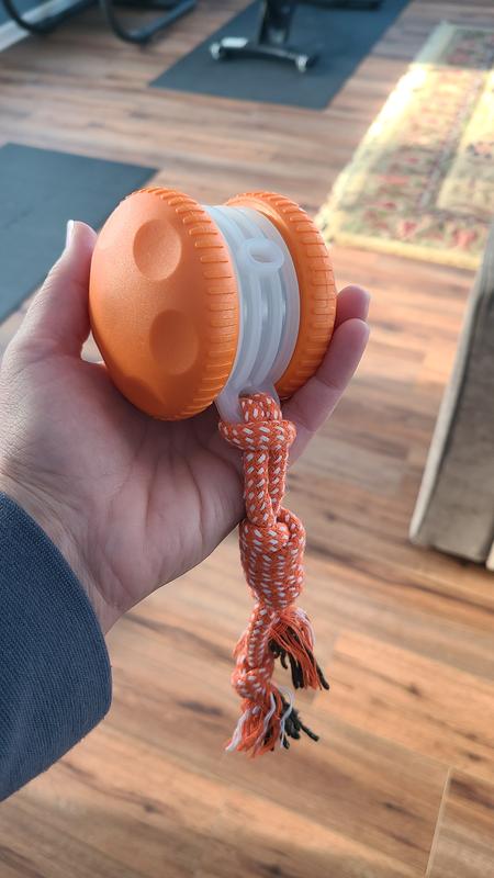 • This ball features an irregular rolling design and rope attachment to keep your pup entertained and engaged.