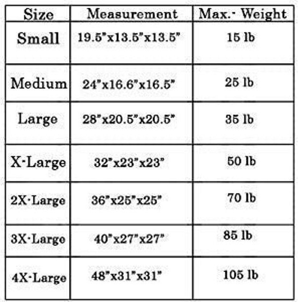 To find the most accurate size, we suggest you measure your pet. Have your dog stand and measure from the tip of the nose to the base of the tail, then add 4 inches to find the length. Next, have your dog sit and measure from the top of the head to the floor, then add 4 inches to find the height. Remember, your dog should be able to stand up and turn around while in their crate.