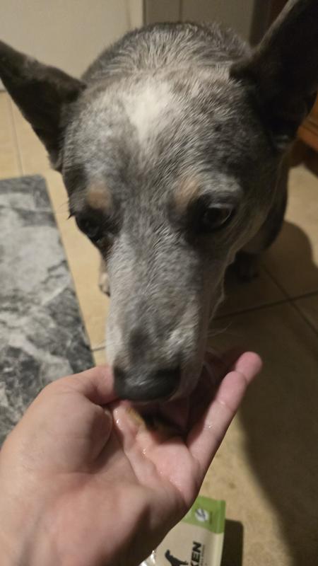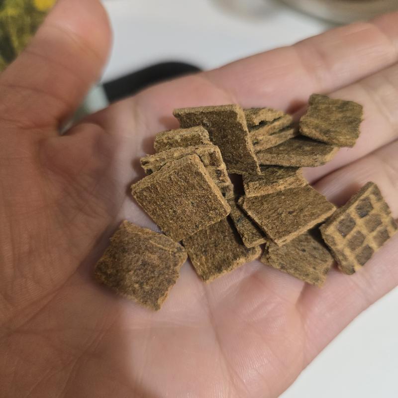 My dogs love these. The ingredients a phenomenal with no fillers. These flat squares make it easy to break up for a topper on their food or even ise as a treat for possitive reinforcement. Since im doing slow transition with these ive only used as a topper for my picky eating dog and it helps her eat her meal. My boy gets them for good behavior as he doesnt have a sensitive stomach like his sister. I have already picked up a second bag.
