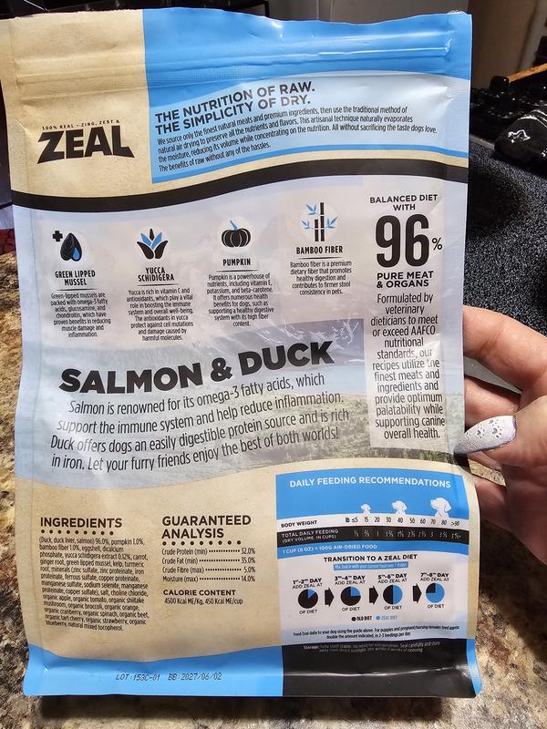 I am so impressed with the Zeal Salmon & Duck food. The ingredients are super clean, and you can actually smell the real salmon and duck when you open the bag —