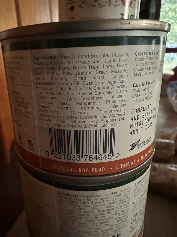 New Zealand Brushtail Possum, Water Sufficient for Processing, Lamb Liver, Lamb Lung, Lamb Green Tripe, Lamb Heart, Lamb Kidney, New Zealand Green Mussels, Lamb Plasma, Dried Yeast, Calcium Carbonate, Salmon Oil, Guar Gum, Agar Agar, Potassium Chloride, Taurine, Choline Chloride, Iron Proteinate, Zinc Glycine Complex, Niacin Supplement, Alpha-Tocopherol Acetate, Sodium Selenite, Manganese Proteinate, Copper Glycine Complex, Thiamine Mononitrate, Calcium Pantothenate, Riboflavin, Pyridoxine Hydrochloride, Vitamin A Acetate, Biotin, Vitamin B12 Supplement, Calcium Iodate, Folic Acid, Cholecalciferol.