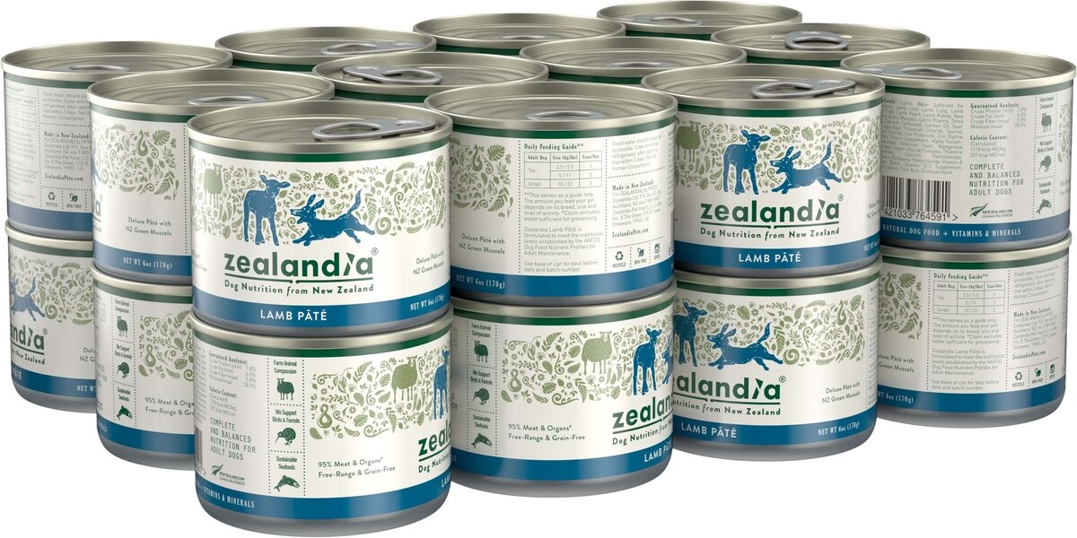 Zealandia canned foods contain a base of superfoods from the sea: fresh New Zealand green-lipped mussels (3%) and salmon oil, accompanied by five lamb organs that provide a powerhouse of diverse nutrients like CoQ10 and vitamins A, B, D, E, and K.