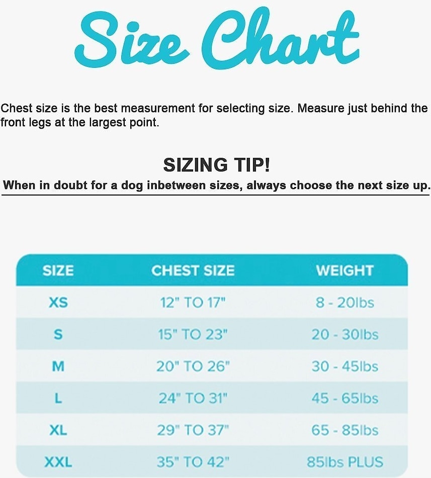 The X-Small fits dogs with a chest girth of 12-17 inches and weighing 8-12 pounds. The Small fits dogs with a chest girth of 15-23 inches and weighing 20-30 pounds. The Medium fits dogs with a chest girth of 20-26 inches and weighing 30-45 pounds. The Large fits dogs with a chest girth of 24-31 inches and weighing 45-65 pounds. The X-Large fits dogs with a chest girth of 29-37 inches and weighing 65-85 pounds. The XX-Large fits dogs with a chest girth of 35-42 inches and weighing 85+ pounds.