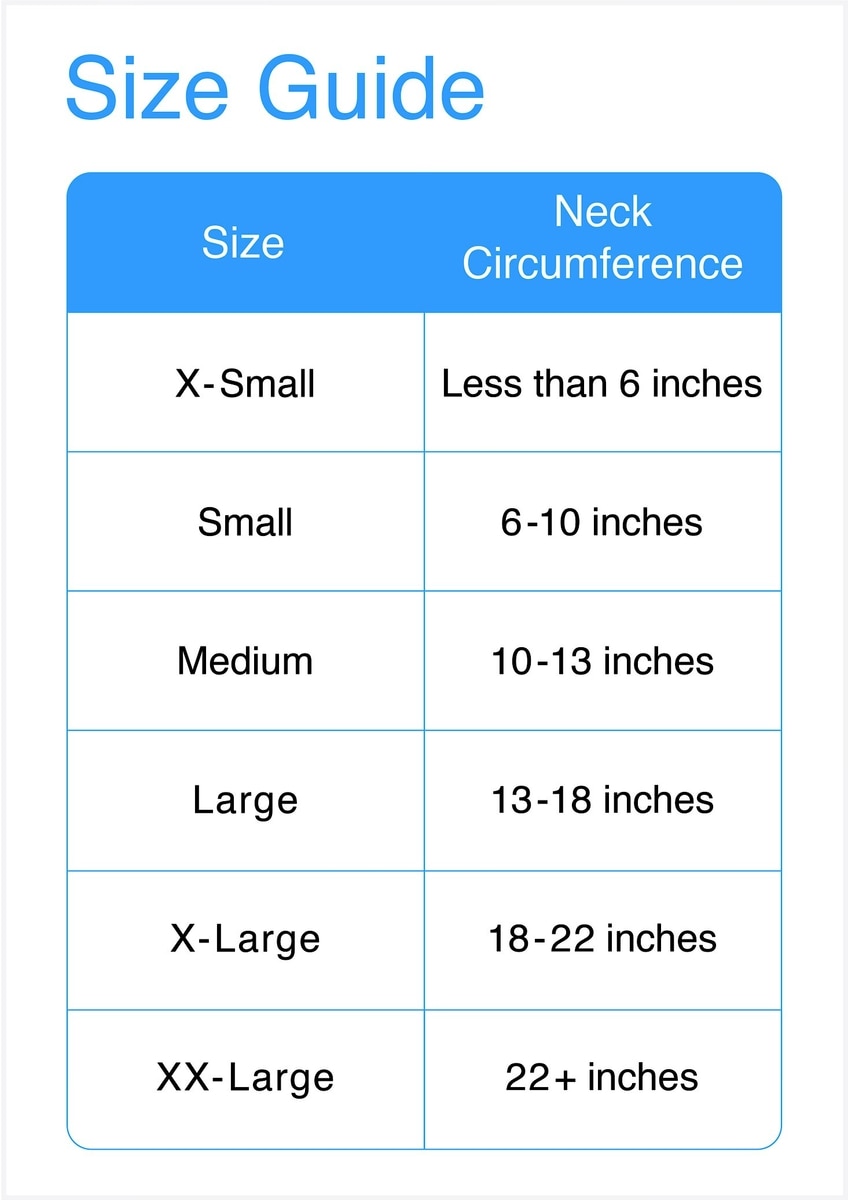 The X-Small size collar fits neck sizes Less than 6 inches, the Small size fits neck sizes 6-10 inches, the Medium size fits neck sizes 10-13 inches, the Large size fits neck sizes 13-18 inches, the X-Large size fits neck sizes 18-22 inches, and the XX-Large size fits neck sizes greater than 22 inches.