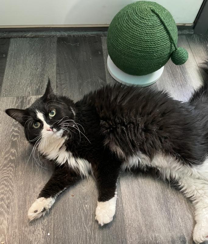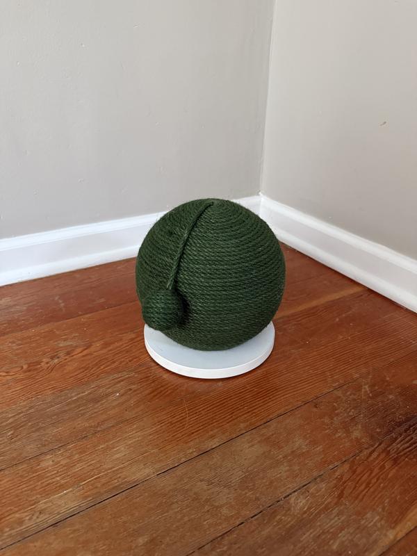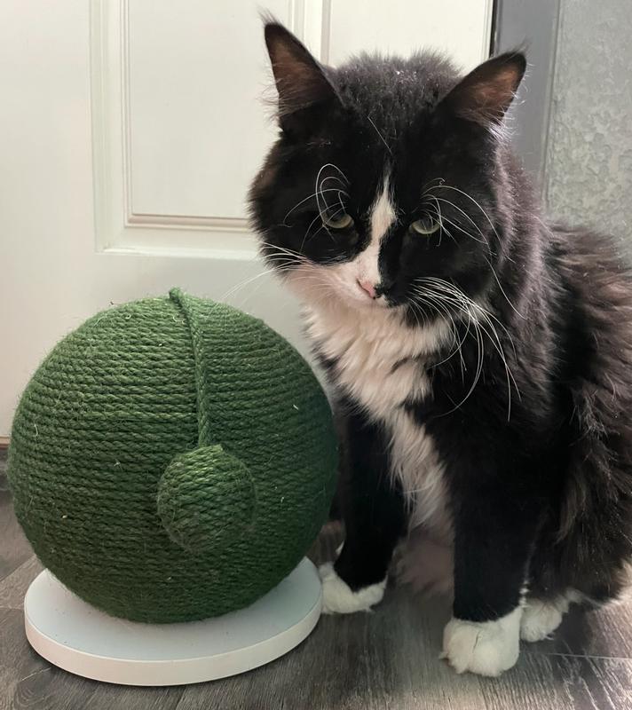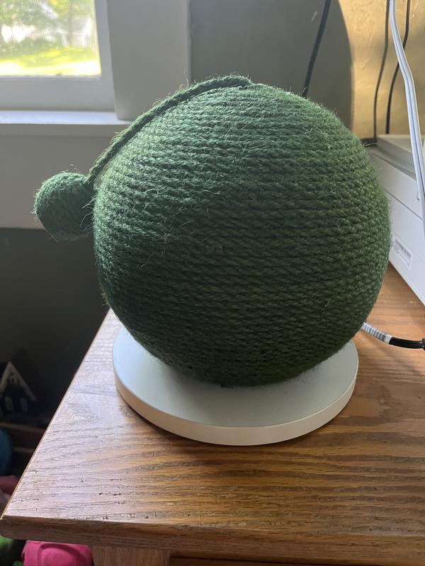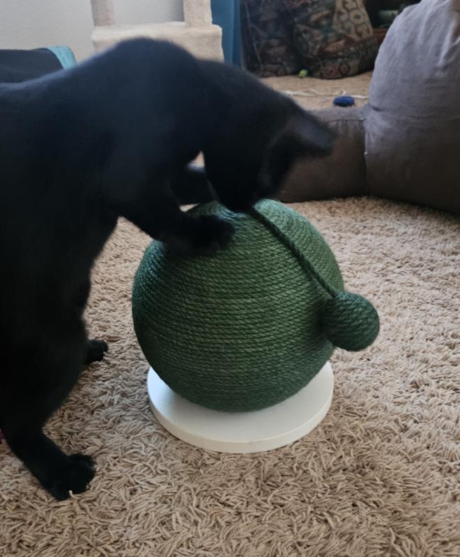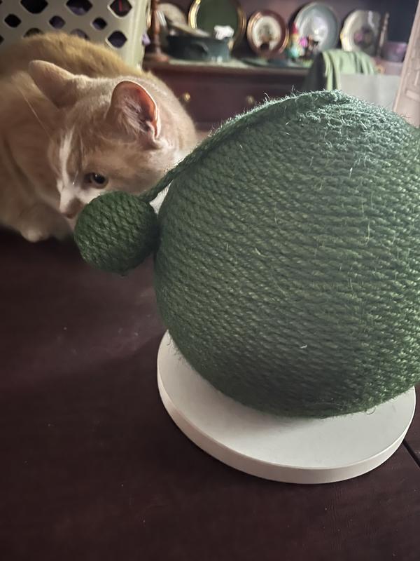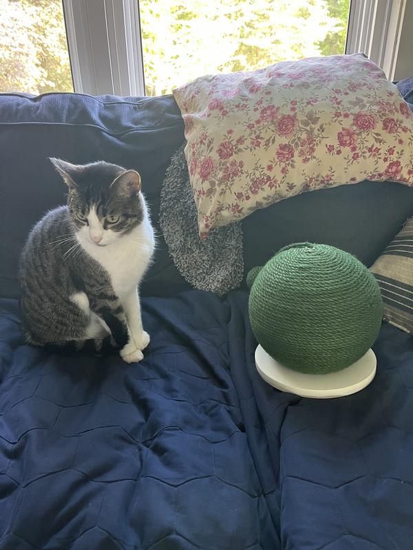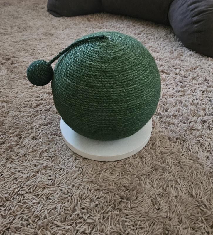 We received this product for review. My cat is picky about his scratchers and I thought this would work for him because the rope is dyed (that softens the texture). It is about the size of a basketball. My 10lb cat is small and he did use it once, but we have had it for about 2 weeks and he ignores it. It is well made and the rope is firmly attached to the ball, making for a great scratcher. This would probably be good for households with kittens or with cats who prefer horizontal scratchers.