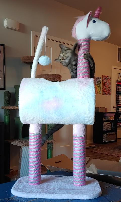 Perfect for our daughters room. We didn’t want a huge tree, but wanted something off the ground too. She and her kitty love this! Easy assembly! Our son ripped the ball off of the string part within the first day, but I don’t think that’s any fault of the items build as much as our wild boy!