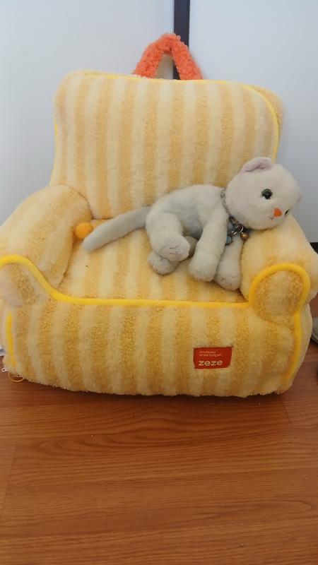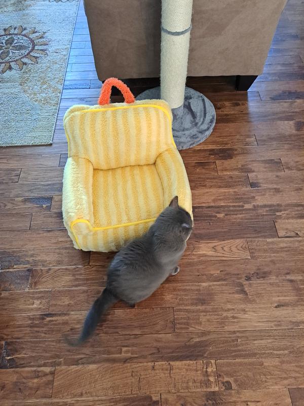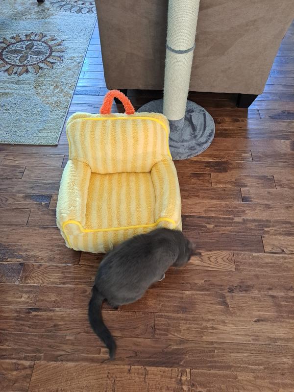 My kittes received a bright yellow plushie sofa bed with orange accents. I think they thought it was a soft fluffy baby chick. They love it! All 3 have crammed into