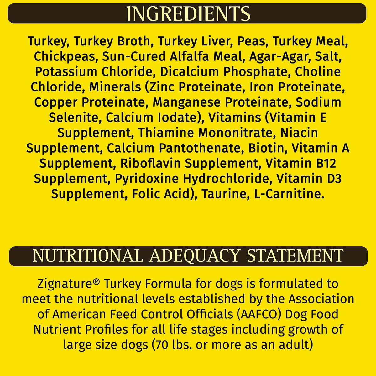 - Zignature Turkey Limited Ingredient Formula Dry Dog Food, 25-lb bag$72.99 Chewy Price$69.34 Autoship PricePromo, New Customers Only: Spend $49+, Get $20 eGift Card +1 deal