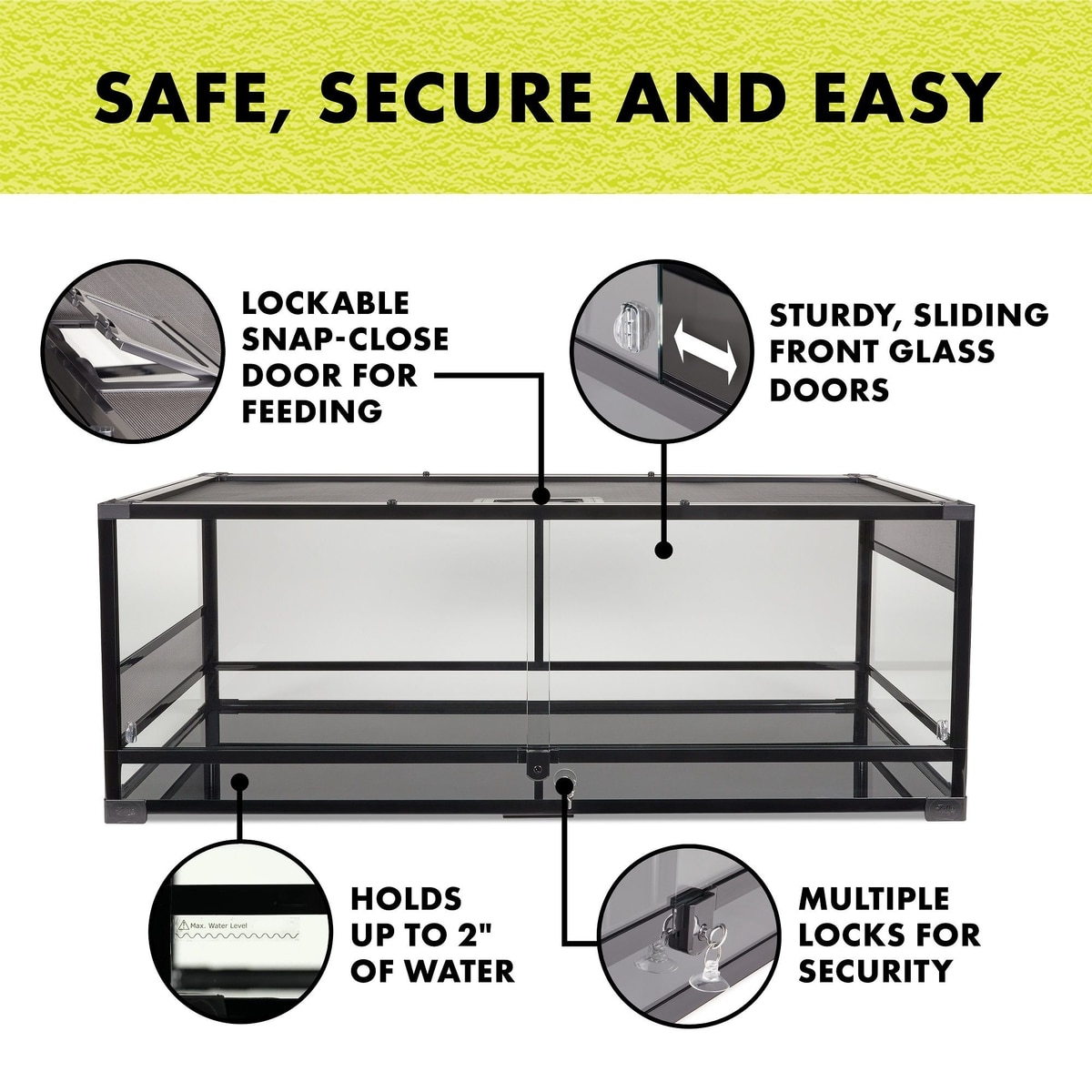 Featuring durable tempered glass, QuickBuild Terrariums let you see into your enclosure from any angle. The habitat’s drop-down, front-opening glass doors lock with thumb screws, and it comes with a cable lock to secure the doors, too.