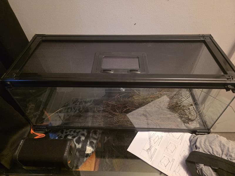 I am thoroughly impressed with this terrarium! This tank checks nearly all the boxes for functionality, aesthetics, and ease of maintenance. What I love about it. Super easy assembly Setting this up was a breeze. The instructions are straightforward and clear, and it took less than 15 minutes to fully assemble. The parts all fit together cleanly and the tank feels solid and secure. The front opening glass door is a huge plus! letting you tend to your pet without having to lift the top screen every time. The top has a double-hinged locking screen with a feeding port. The access points are secure, which helps give peace of mind that your pet won’t escape. The easy-clean bedding tray is one of the standout features to me. It slides out making substrate changes and waste removal much less messy and time consuming. It really makes cleaning it a lot more manageable. It feels very sturdy and the tempered-glass panels offer great visibility. I’d happily recommend this terrarium to others!