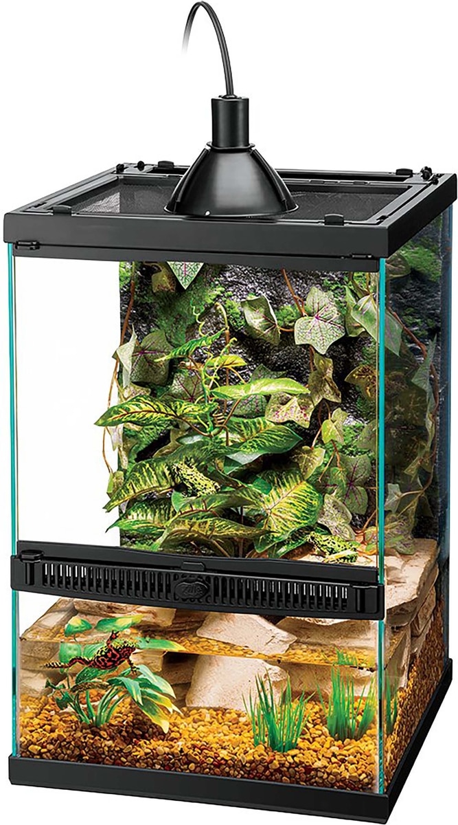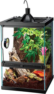 Each kit comes with a glass terrarium, light fixtures and odor-fighting carpet substrate. The humidity/temperature gauge makes it easy to maintain the ideal environment, and the screen cover will keep your reptile safe and secure inside their home.
