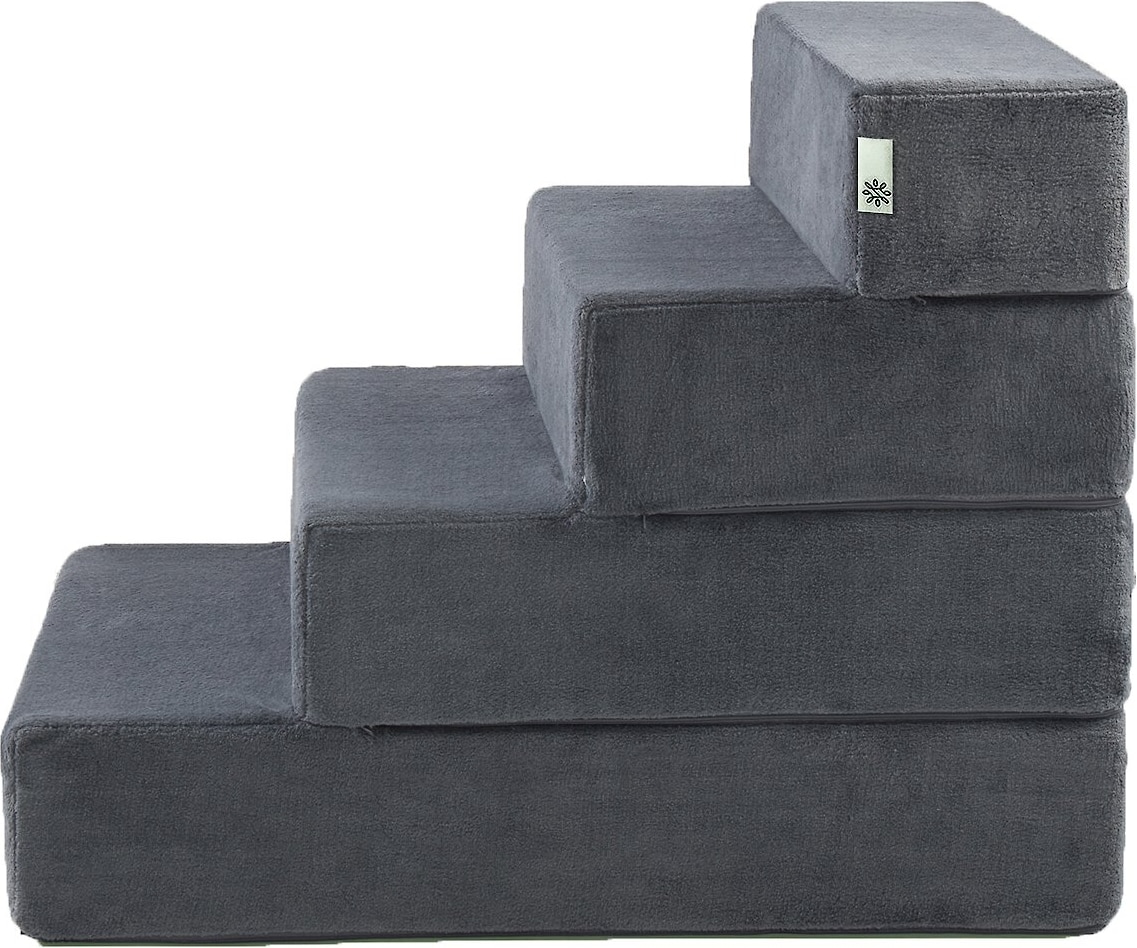 The X-Small stairs measure 17 inches long by 14 inches wide by 13 inches tall, each step is 6.5 inches high and 8.5 inches deep. The Small stairs measure 21 inches long by 18 inches wide by 15 inches tall, each step is 5 inches high by 7 inches deep. The Medium stairs measure 21 inches long by 18 inches wide by 18 inches tall, each step is 6 inches high by 7 inches deep. The Large stairs measure 28 inches long by 18 inches wide by 22 inches tall, each step is 5.5 inches high by 7 inches deep. The X-Large stairs measure 28 inches long by 21 inches wide by 24 inches tall, each step is 6 inches high by 7 inches deep.