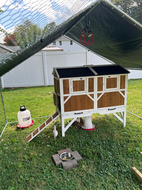 - Coop is lifted up off of the ground for your flock’s comfort, security, and easy access to the coop.